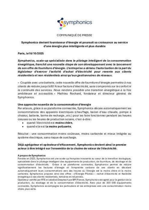 Symphonics, scale-up spécialisée dans le pilotage intelligent de la consommation énergétique, franchit une nouvelle étape de son développement avec le lancement de son offre de fourniture d’énergie. L’entreprise a obtenu l’autorisation de la part du législateur d’exercer l’activité d’achat d’électricité pour revente aux clients résidentiels et non résidentiels ainsi qu’aux gestionnaires de réseaux.