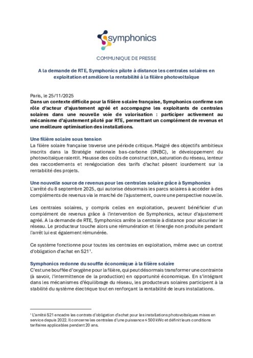Dans un contexte difficile pour la filière solaire française, Symphonics confirme son rôle d’acteur d’ajustement agréé et accompagne les exploitants de centrales solaires dans une nouvelle voie de valorisation : participer activement au mécanisme d’ajustement piloté par RTE, permettant un complément de revenus et une meilleure optimisation des installations.