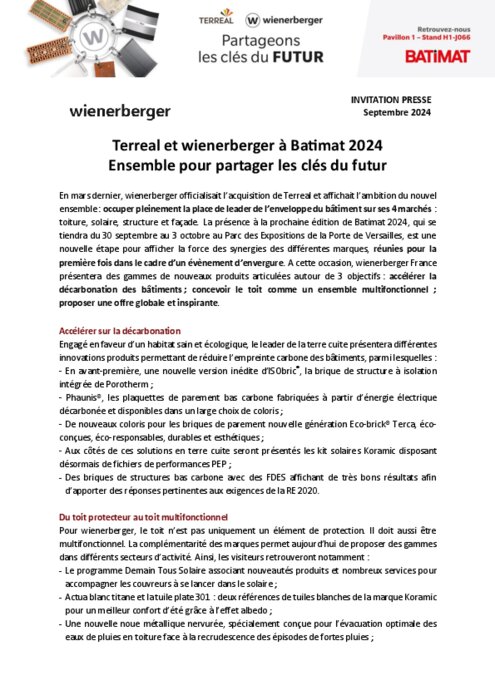 En mars dernier, wienerberger officialisait l’acquisition de Terreal et affichait l’ambition du nouvel ensemble : occuper pleinement la place de leader de l’enveloppe du bâtiment sur ses 4 marchés : toiture, solaire, structure et façade. La présence à la prochaine édition de Batimat 2024, qui se tiendra du 30 septembre au 3 octobre au Parc des Expositions de la Porte de Versailles, est une nouvelle étape pour afficher la force des synergies des différentes marques, réunies pour la première fois dans le cadre d’un évènement d’envergure.