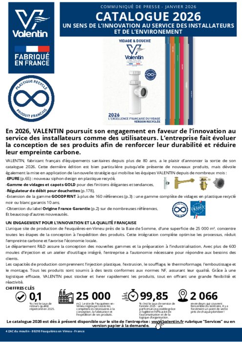 Industriels 12 janvier 2026 - 15:54 En 2026, VALENTIN poursuit son engagement en faveur de l’innovation au service des installateurs comme des utilisateurs. L’entreprise fait évoluer la conception de ses produits afin de renforcer leur durabilité et réduire leur empreinte carbone. PDF (587 Ko) Télécharger