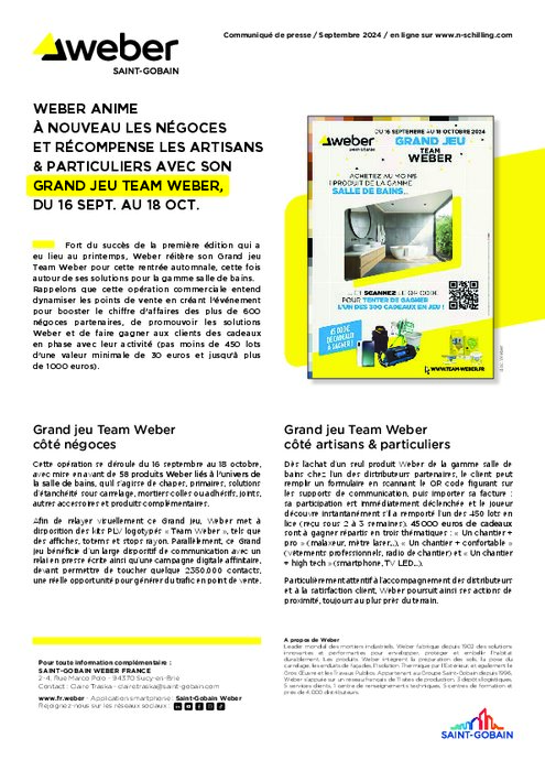 Fort du succès de la première édition qui a eu lieu au printemps, Weber réitère son Grand jeu Team Weber pour cette rentrée automnale, cette fois autour de ses solutions pour la gamme salle de bains. Rappelons que cette opération commerciale entend dynamiser les points de vente en créant l’événement pour booster le chiffre d’affaires des plus de 600 négoces partenaires, de promouvoir les solutions Weber et de faire gagner aux clients des cadeaux en phase avec leur activité (pas moins de 450 lots d’une valeur minimale de 30 euros et jusqu’à plus de 1000 euros).