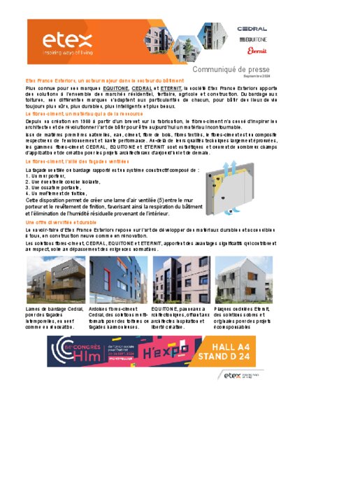 Plus connue pour ses marques EQUITONE, CEDRAL et ETERNIT, la société Etex France Exteriors apporte des solutions à l'ensemble des marchés résidentiel, tertiaire, agricole et construction. Du bardage aux toitures, ses différentes marques s'adaptent aux particularités de chacun, pour bâtir des lieux de vie toujours plus sûrs, plus durables, plus intelligents et plus beaux.