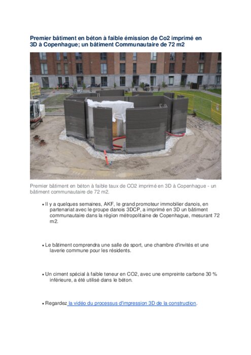 Il y a quelques semaines, AKF, le grand promoteur immobilier danois, en partenariat avec le groupe danois 3DCP, a imprimé en 3D un bâtiment communautaire dans la région métropolitaine de Copenhague, mesurant 72 m2. Le bâtiment comprendra une salle de sport, une chambre d'invités et une laverie commune pour les résidents. Un ciment spécial à faible teneur en CO2, avec une empreinte carbone 30 % inférieure, a été utilisé dans le béton.